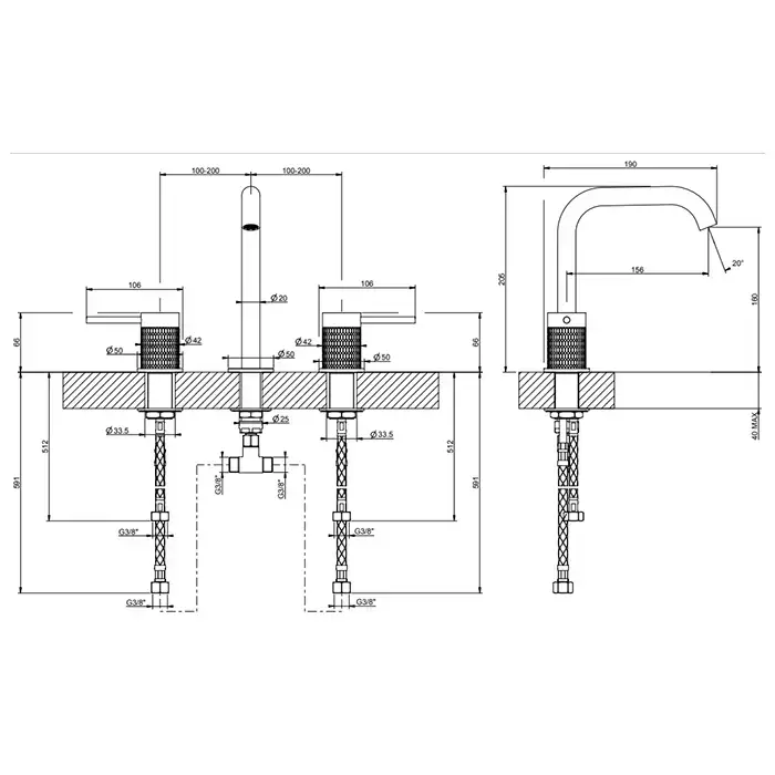Gessi 316 Смеситель для раковины на 3 отверстия, без донного клапана, излив 156мм, h=201мм, цвет: brushed black metal pvd