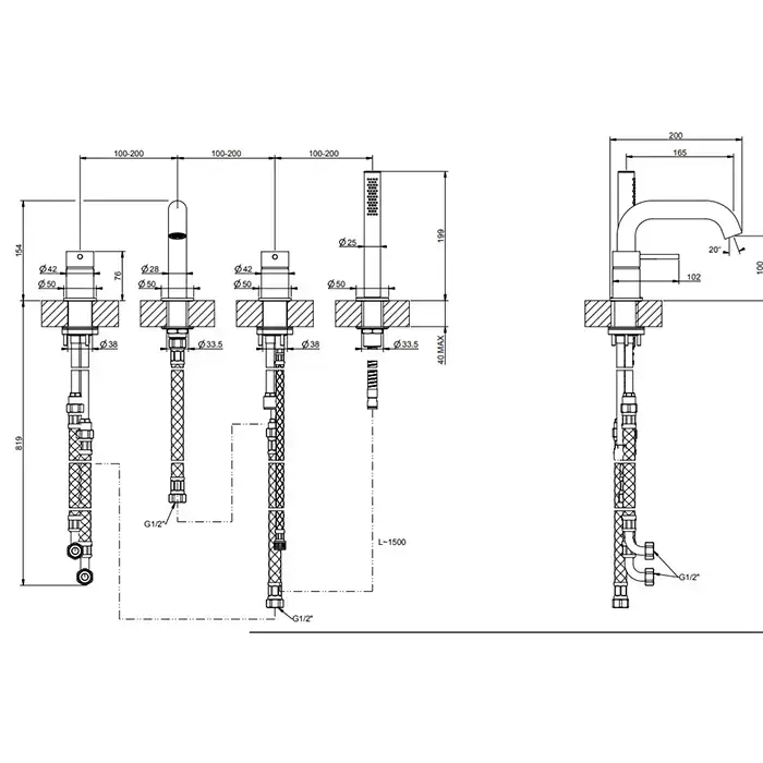 Gessi 316 Смеситель для ванны на 4 отв., с переключателем, изливом и шлангом 1,50 м, цвет: brushed black metal pvd