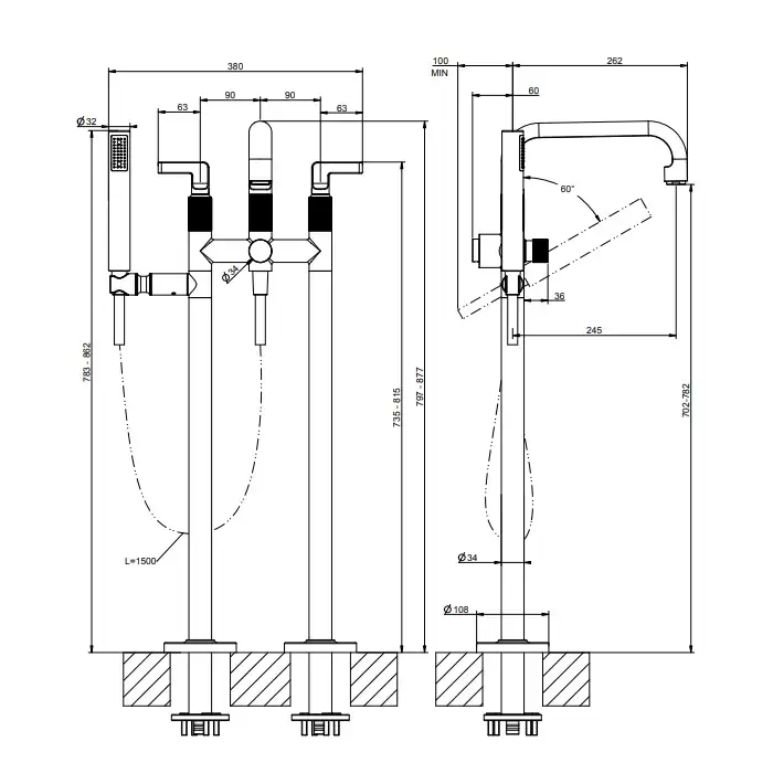 Gessi Inciso Напольный смеситель для ванны с ручным душем, цвет: Black Metal Brushed PVD