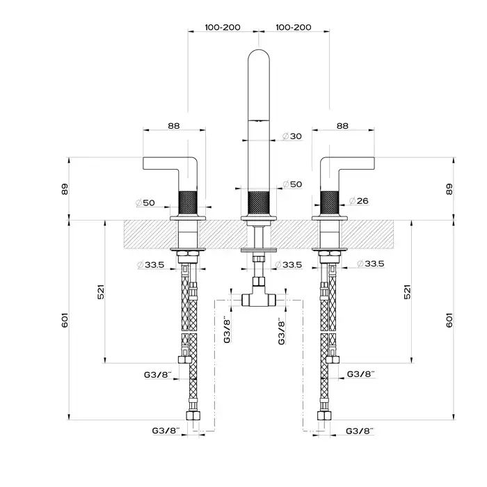 Gessi Inciso- Смеситель для раковины на 3 отверстия, соединительные шланги на 3/8”, без донного клапана, цвет: black XL