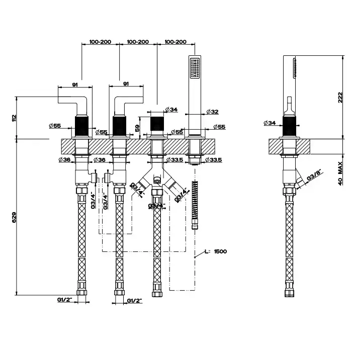 Gessi Inciso Смеситель для ванны, на 4 отв., с переключатель потоков, шланг 150см, и ручным душем, цвет: золото