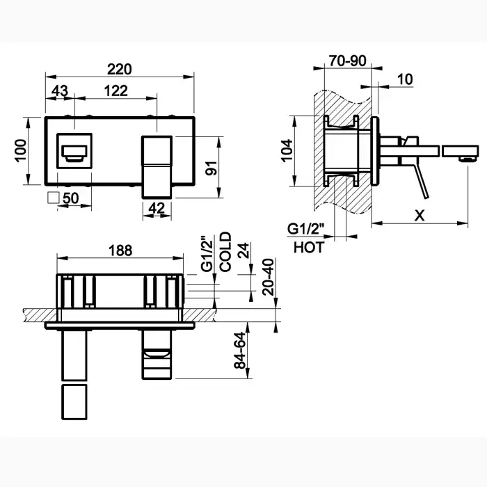 Gessi Rettangolo K Встраиваемый однорычажный смеситель для раковины с индивидуальной длиной излива (70-300мм), внешние части, цвет: хром