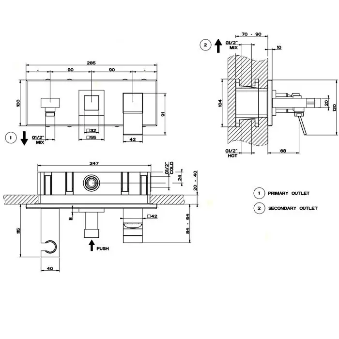 Gessi Rettangolo K Встраиваемый смеситель, с подводом воды, держателем лейки и переключателем PUSH, внешняя часть, цвет: хром