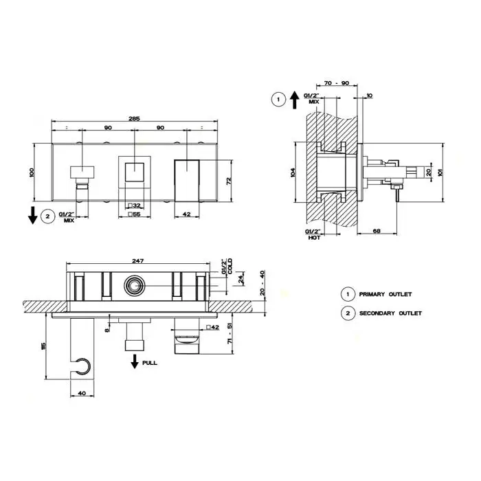 Gessi Rettangolo Встраиваемый смеситель с изливом, подводом воды, держателем лейки и переключателем PULL, внешняя часть, цвет: хром