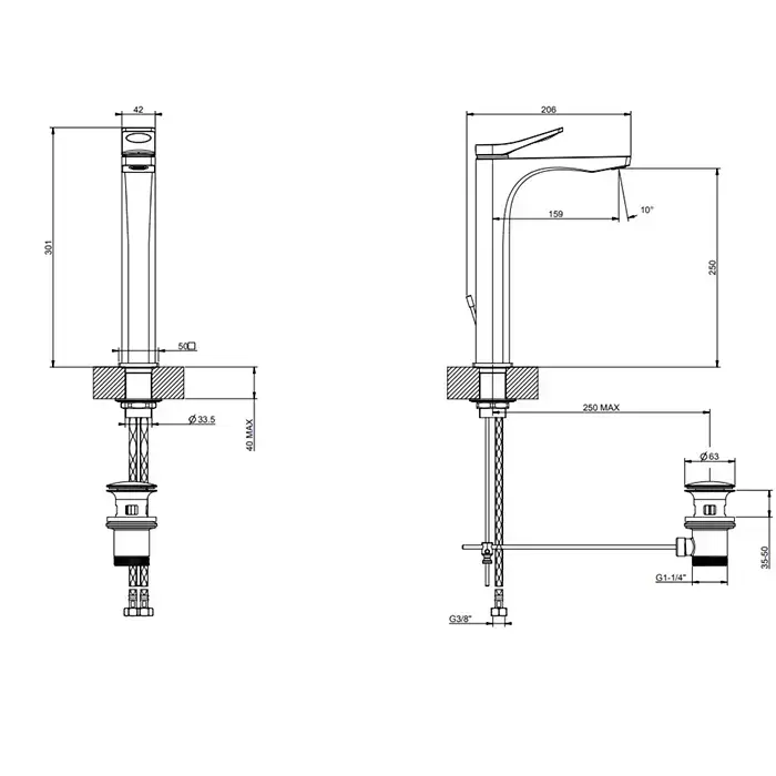 Gessi Rilievo Смеситель для раковины на 1 отв. с донным клапаном h=301мм, излив 159мм , цвет: black XL