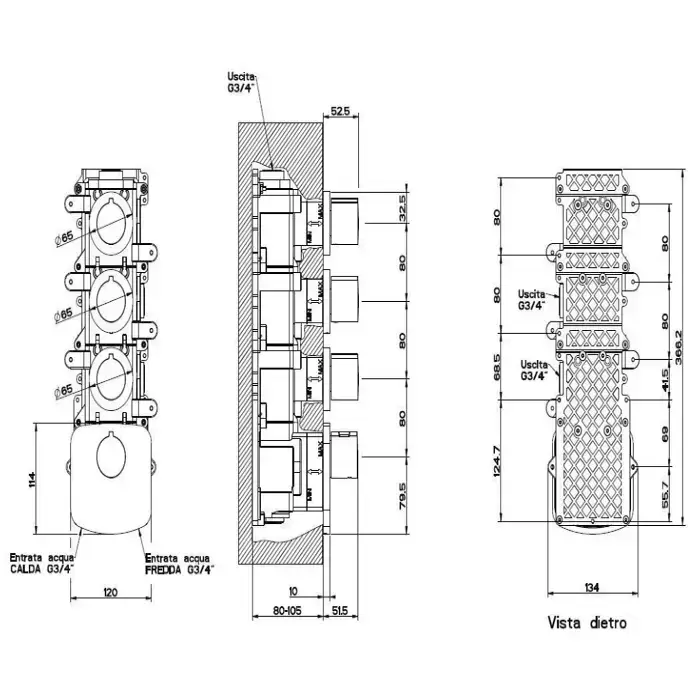 Gessi Tondo Встраиваемый термостат для душа, с 3мя независимыми выходами, верт/гориз установка, внешняя часть, цвет: хром
