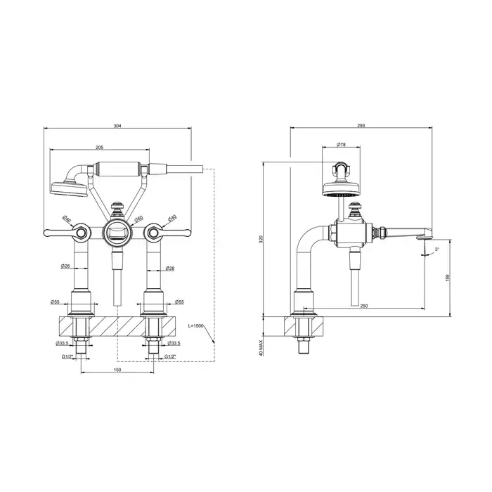 Gessi Venti20 Смеситель для установки на борт ванны на 2 отверстия, с ручным душем и шлангом 150см., цвет: Finox Brushed Nickel