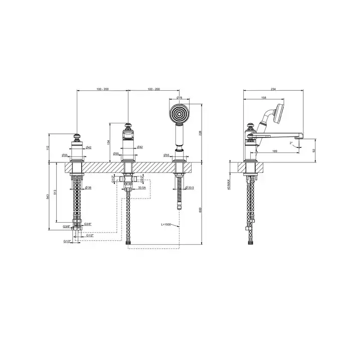 Gessi Venti20 Смеситель для установки на борт ванны на 3 отверстия, однорычажный, с ручным душем и шлангом 1500 мм., цвет: черный матовый
