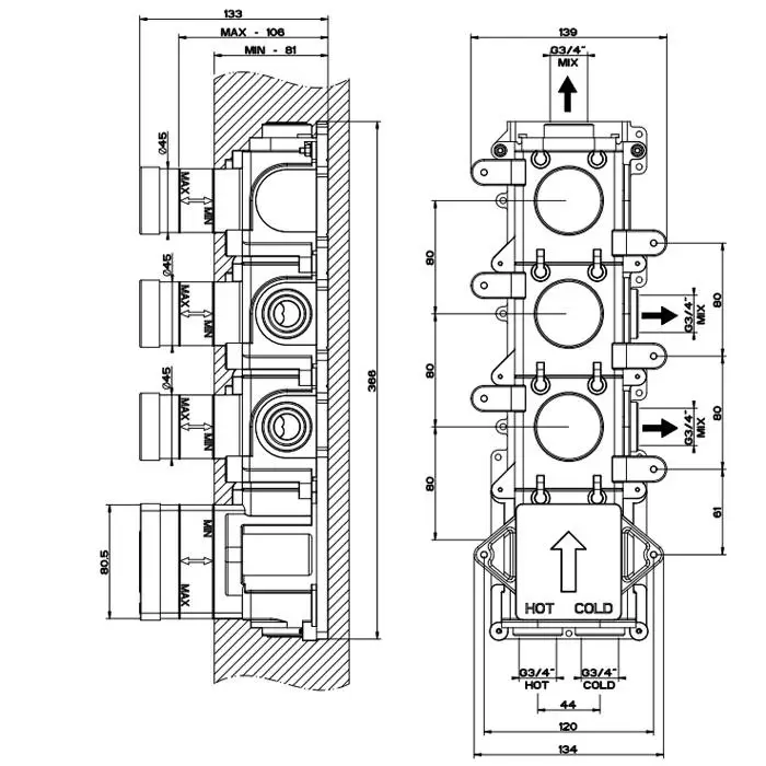Gessi Внутренняя часть встраиваемого термостатического смесителя с 3мя независимыми выходами