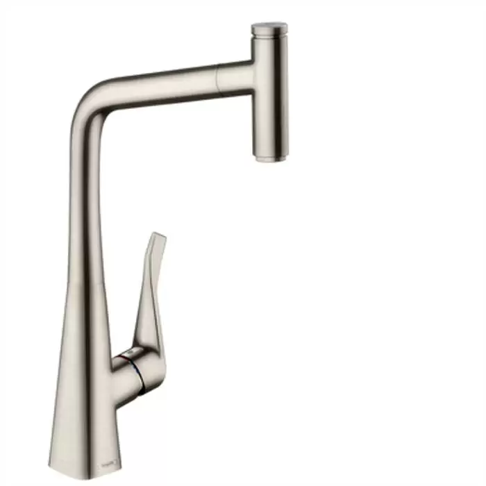 Hansgrohe Metris Select M71 Смеситель для кухни, на 1 отв, поворотный излив: 23.5см с вытяжным душем, 1jet, h: 33.3см, sBox, кнопка вкл/выкл, цвет: нержавейка
