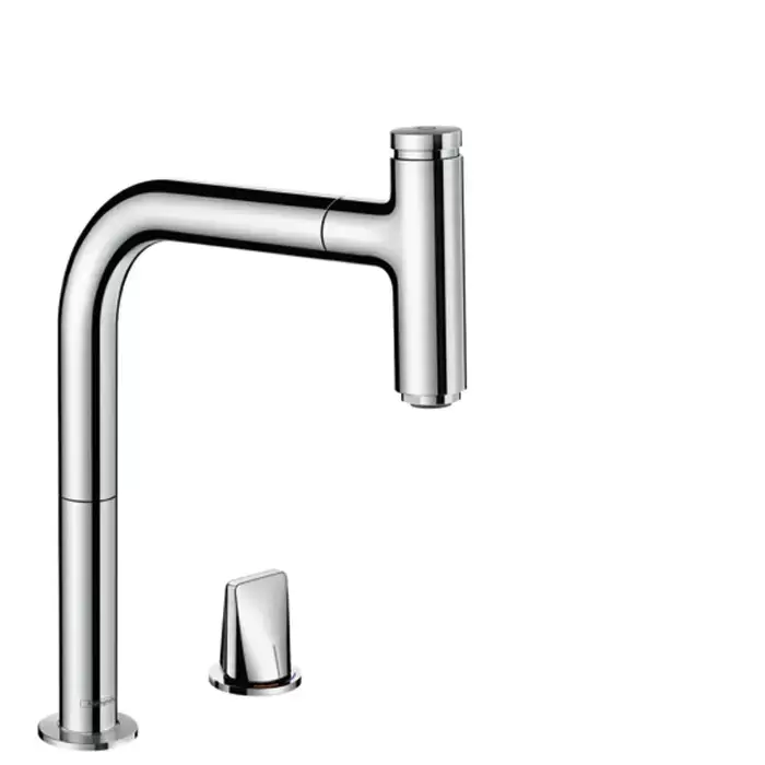 Hansgrohe Metris Select M71 Смеситель для кухни, на 2 отв, поворотный излив: 22.1см с вытяжным душем, 1jet, h:20.8см, sBox, кнопка вкл/выкл, цвет: хром