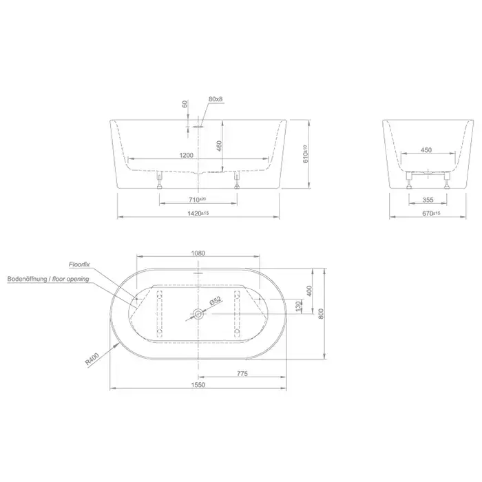 Knief Fresh XS Ванна отдельностоящая 155х80х60см.,слив щелевой, без слив-перелива, цвет: белый глянцевый