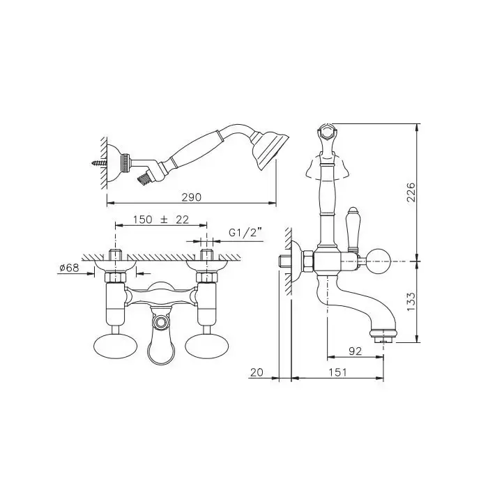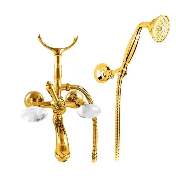 Nicolazzi Cristallo Di Rocca Смеситель для ванны с 2мя ручками, с переключателем ванна/душ, + комплект руч. душа, цвет: золото