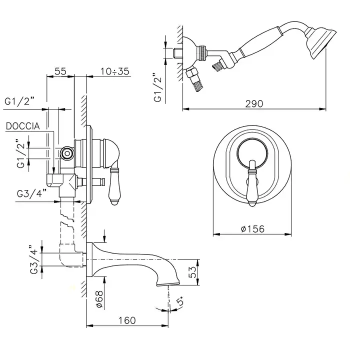 Nicolazzi Cristallo Liberty Смеситель для ванны однорычажный, встраиваемый, с изливом 160мм и ручным душем, цвет: хром