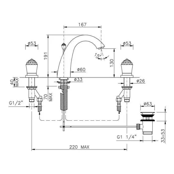 Nicolazzi Cristallo Смеситель для раковины на 3 отверстия, с донным клапаном, излив: 167мм, цвет: хром