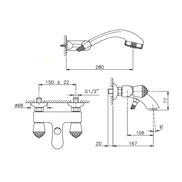 Nicolazzi Cristallo Смеситель для ванны с 2мя ручками, с душевой лейкой, цвет: хром