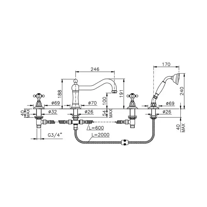Nicolazzi El Capitan Смеситель для ванны на 4 отверстия, изливом 246мм и ручным душем, цвет: бронза
