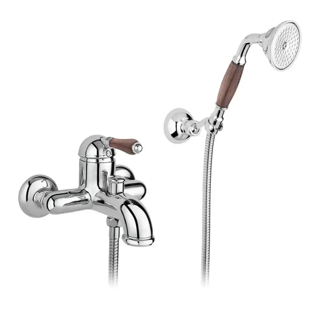 Nicolazzi Forest Смеситель для ванны однорычажный, настенный, с ручным душем, ручки дерево, цвет: хром