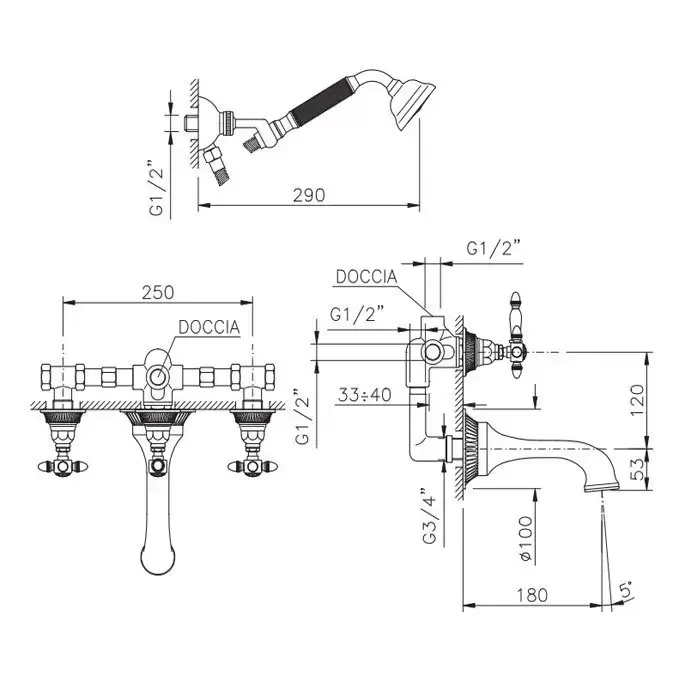 Nicolazzi Impero Смеситель для ванны с 2мя ручками, встроенный, вкл. внутр часть + комплект руч. душа, цвет: золото