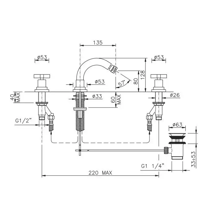Nicolazzi Monte Croce Смеситель для биде на 3 отверстия, с 2мя ручками, излив: 135мм, цвет: золото