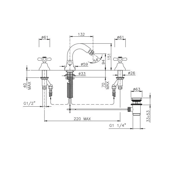 Nicolazzi Nuova Brenta Смеситель для биде на 3 отверстия, с донным клапаном, излив: 132мм, цвет: Gold Brass