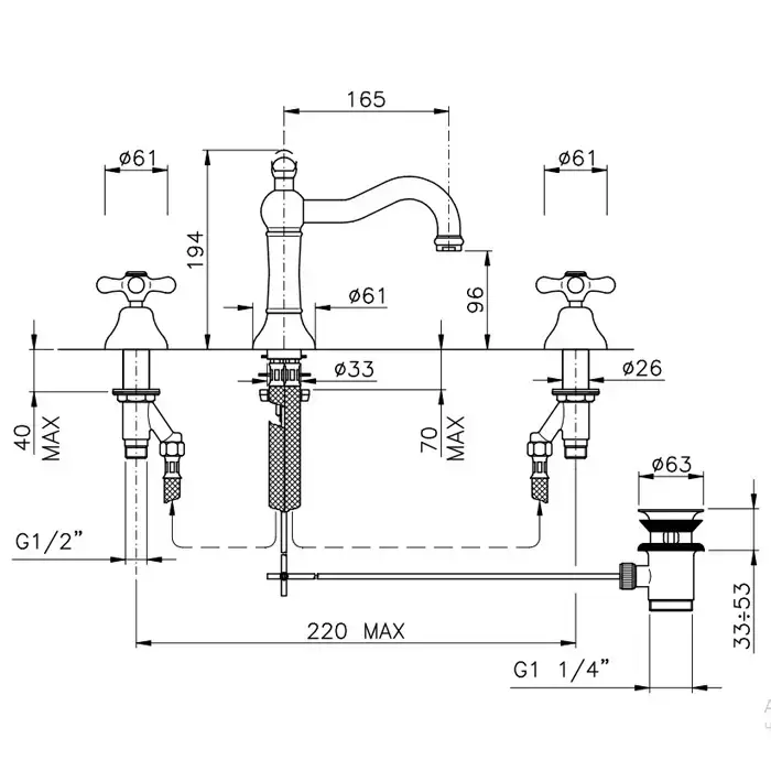 Nicolazzi Nuova Brenta Смеситель для раковины на 3 отверстия, с донным клапаном, излив: 165мм, цвет: Gold Brass