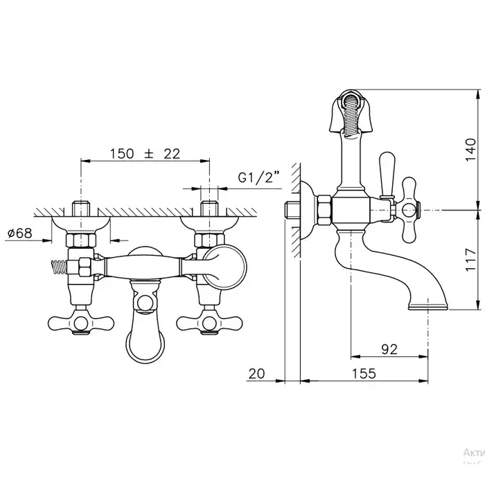Nicolazzi Nuova Brenta Смеситель для ванны с 2мя ручками, настенный, с душевой лейкой, цвет: Gold Brass