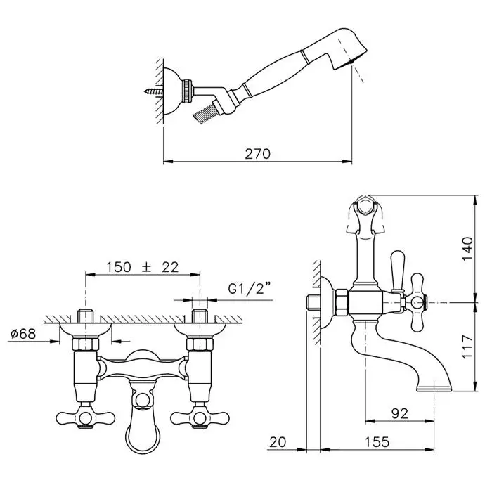 Nicolazzi Nuova Brenta Смеситель для ванны с 2мя ручками, настенный, с душевой лейкой, цвет: хром