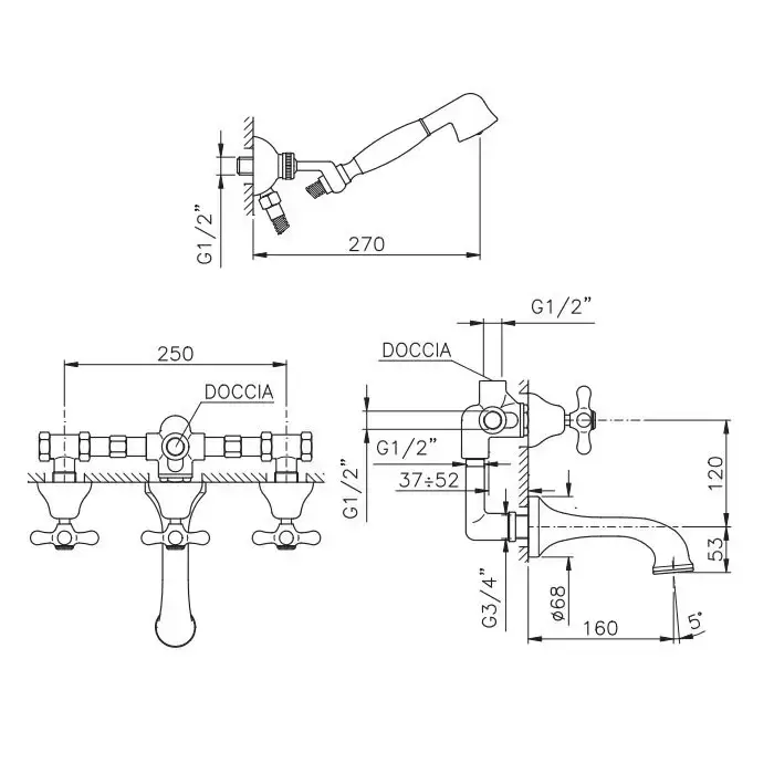 Nicolazzi Nuova Brenta Смеситель для ванны трехвентильный встраиваемый, с душевой лейкой, излив: 160 мм, цвет: Gold Brass