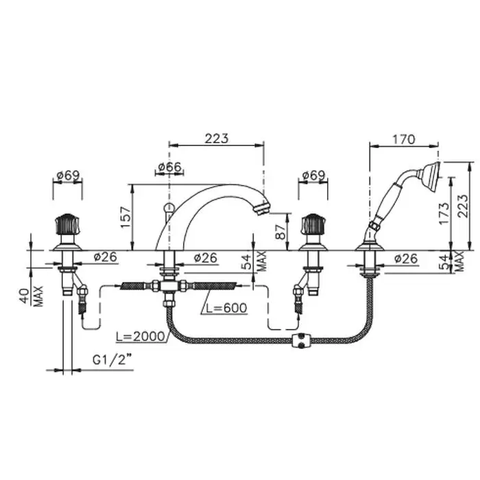 Nicolazzi Onice Смеситель на борт ванны, 4 отв., излив: 223 мм, с ручным душем, цвет:хром