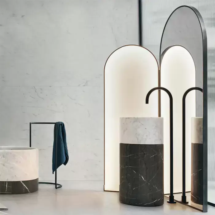 NOORTH milldue edition ROMA Комплект 150см из напольного зеркала со створкой с подсветкой, напольной раковины из гладкого и фрезерованного мрамора, Цвет: bianco carrara-A10L/grafite-A51F