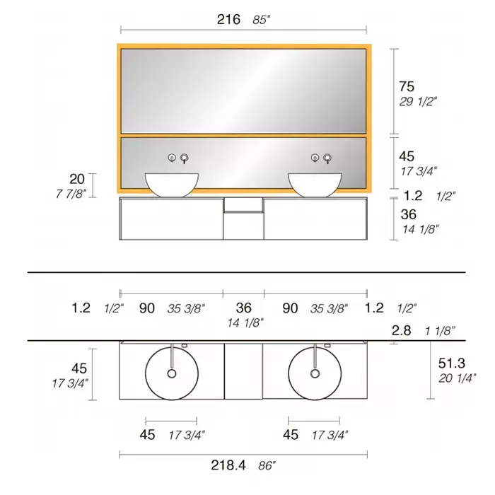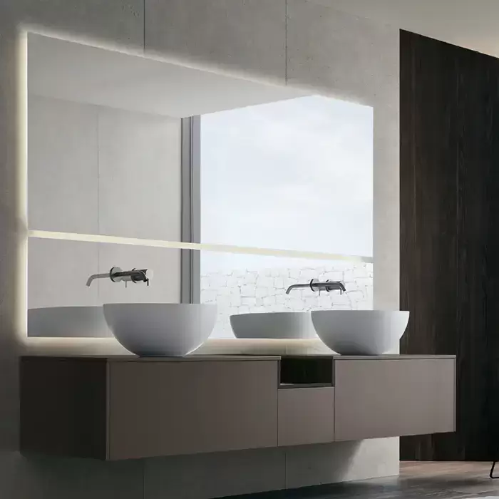 NOORTH milldue edition SINTESI Комплект мебели 216см в матовом лаке/шпоне, с 2-мя раковинами из Cristalplant, 2-мя зеркалами с подсветкой, подвесной, Цвет: castoro-11/rovere carbone-601