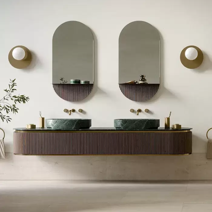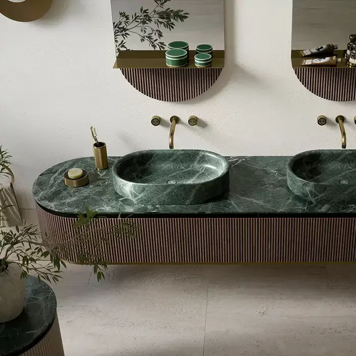 Oasis Naos Композиция №1 Комплект мебели 236х56xh32см, подвесной, мраморный топ verde alp, цвет: золото матовое/орех трубчатый