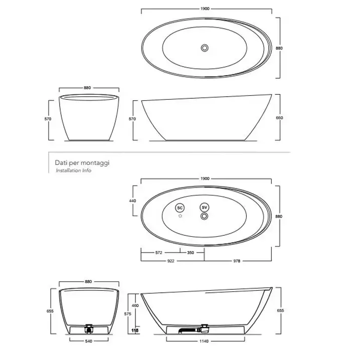 Simas Bohemien Ванна отдельностоящая, из Crystal Tech 190x88x66 см со сливной арматурой