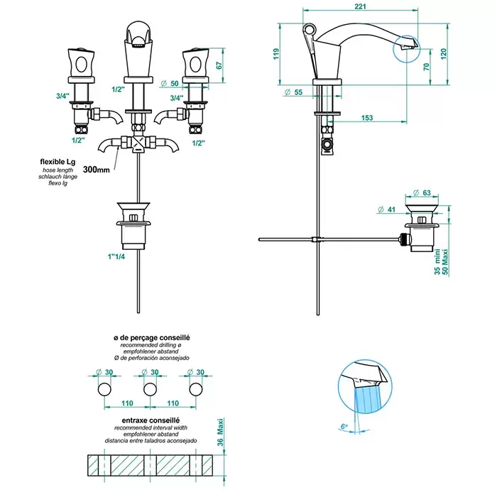 THG Bagatelle metal Смеситель для раковины, 3 отв., цвет: хром