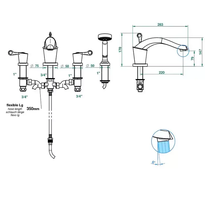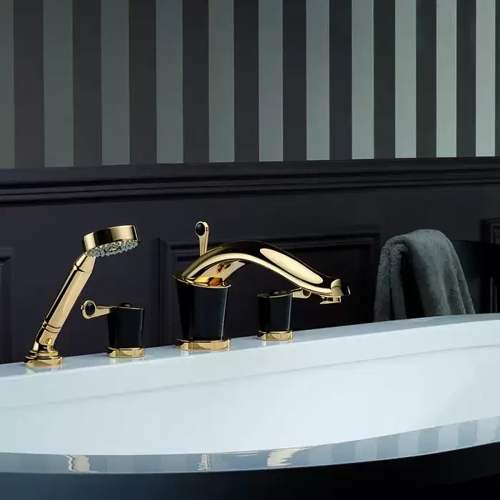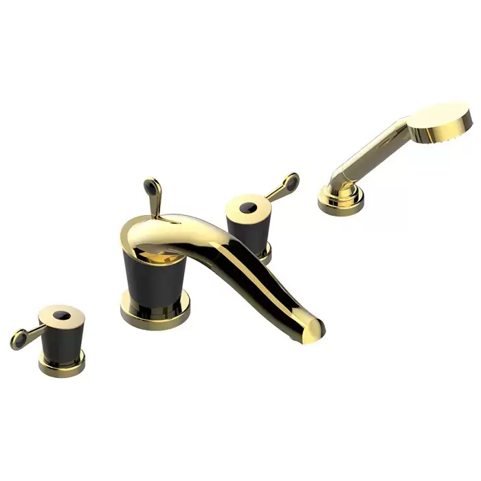 THG BAGATELLE PIERRE NOIRE MANETTES Смеситель для для установки на борт ванны на 4 отверстия, с ручным душем, ручки черные, цвет: полированное золото
