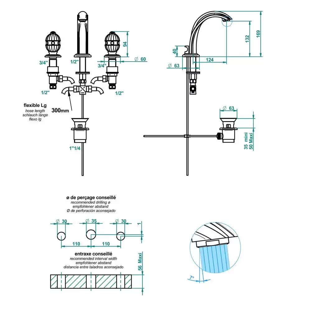 THG Cheverny Lapis Lazuli Смеситель для раковины, 3 отв., цвет: золото/лазурит