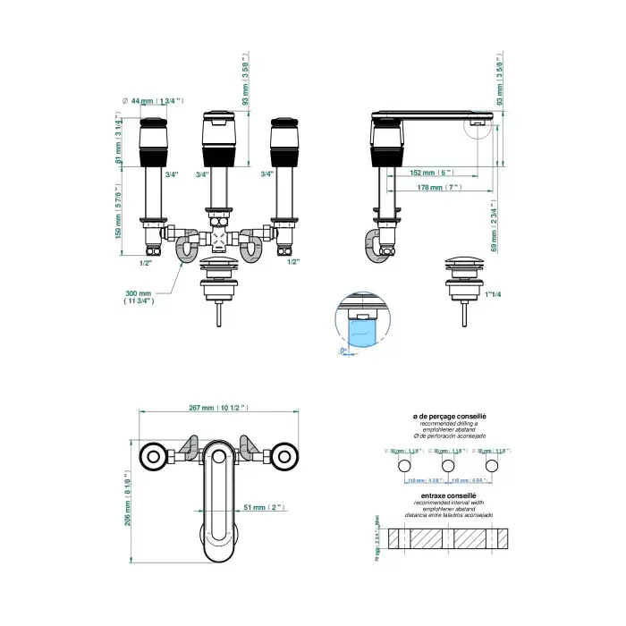 THG CORVAIR FIOR DI BOSCO Смеситель для раковины на 3 отверстия, для установки на мраморную столешницу, с донным клапаном, цвет: Blush PVD