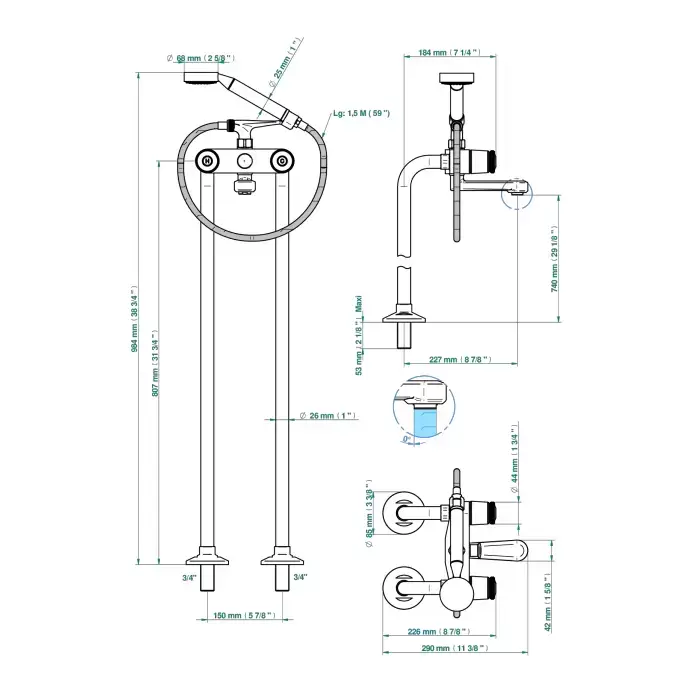THG CORVAIR Смеситель для ванны напольный, с ручным душем и шлангом 1500 мм., цвет: полированное золото