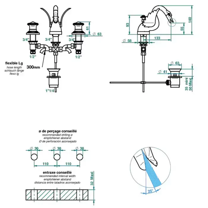 THG Cygne Смеситель для раковины на 3 отверстия, низкий излив, с донным клапаном, цвет: полированное золото