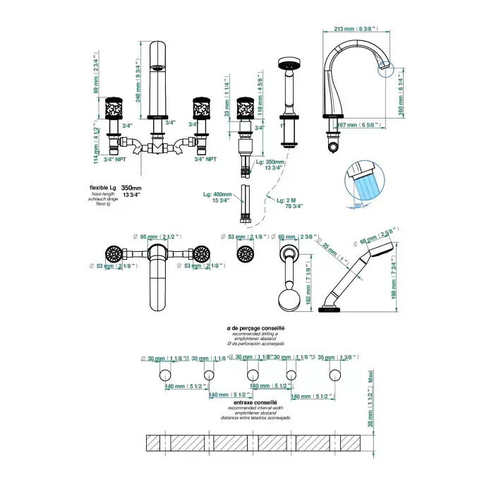 THG Hirondelles Gold Stamped Смеситель на борт ванны, 5 отв., с ручным душем, цвет: Soft gold