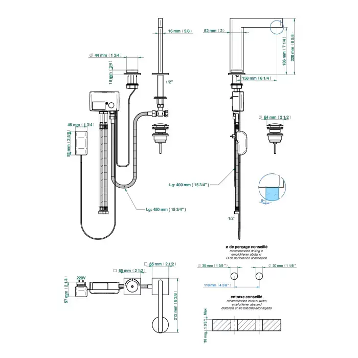 THG ICON-X CARBONE GOLD A MANETTES Смеситель для раковины, 2 отв., электронный, с донным клапаном, цвет: полированное золото