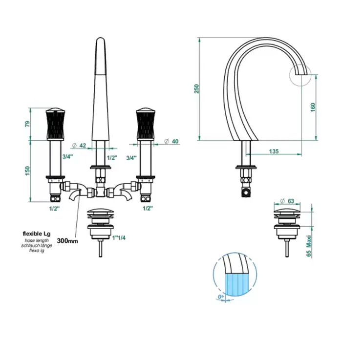 THG Infini Porcelaine Blanche Смеситель для раковины, на 3 отв., для увеличенных по толщине столешниц, с донным клапаном, цвет: Matt gold PVD