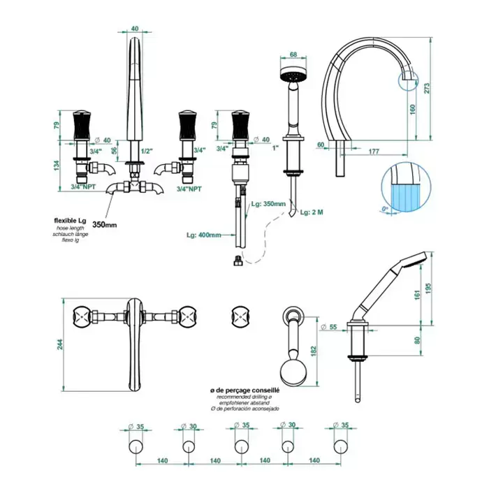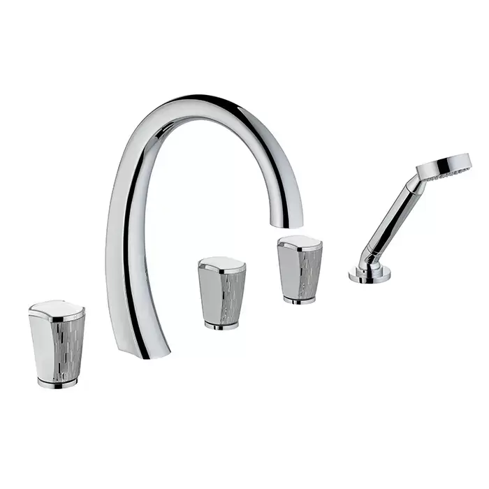 THG Infini white porcelain with platinum decor Смеситель на борт ванны на 5 отверстий, с прогрессивным смесителем для ручного душа, ручной душ, цвет: хром