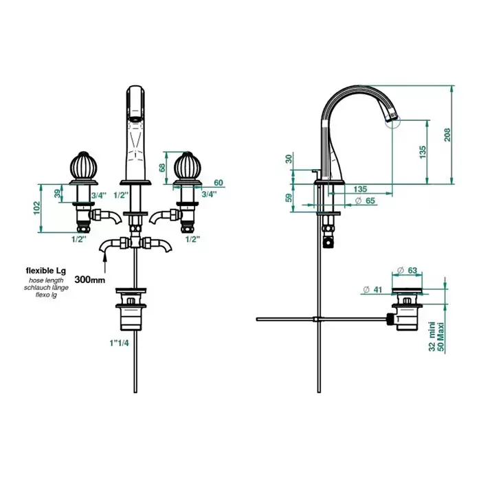 THG Mandarine satin crystal Смеситель для раковины на 3 отверстия, с донным клапаном, цвет: полированное золото