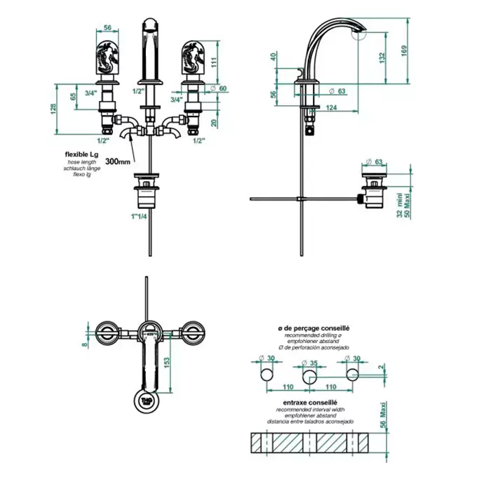 THG Naïade Смеситель для раковины на 3 отверстия, с донным клапаном, цвет: Soft gold