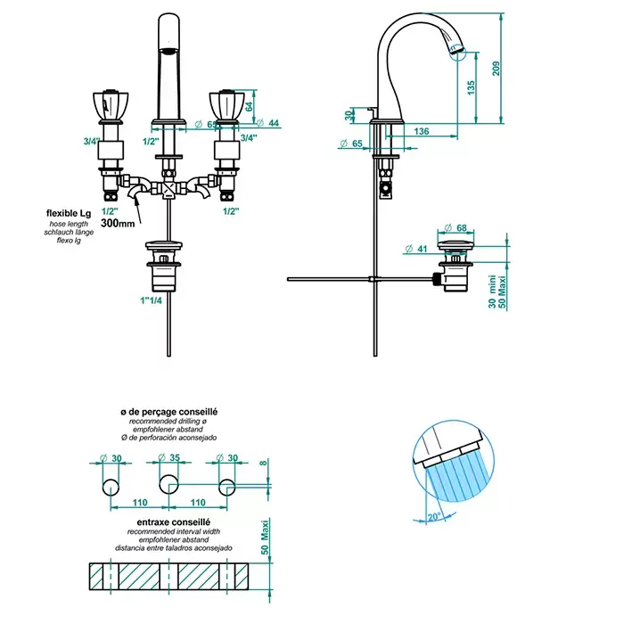 THG Petale de Cristal clair lisere dore Смеситель для раковины, 3 отв., цвет: золото/прозрачный хрусталь с золотым декором