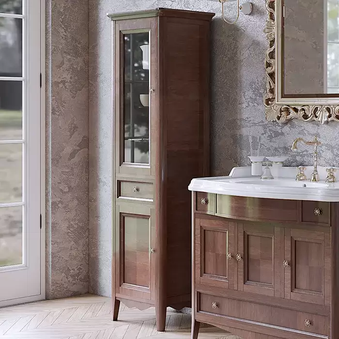 TW Veronica Nuovo колонна напольная с 2-мя дверцами, 1-м выдвижным ящиком, 3-мя стеклянными полками, доводчиками Blum, ручки бронза, SX - петли слева, Цвет: noce