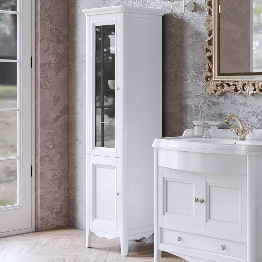 TW Veronica Nuovo колонна напольная с 2-мя дверцами, 3-мя стеклянными полками, доводчиками Blum, ручки бронза, SX - петли слева, цвет: белый