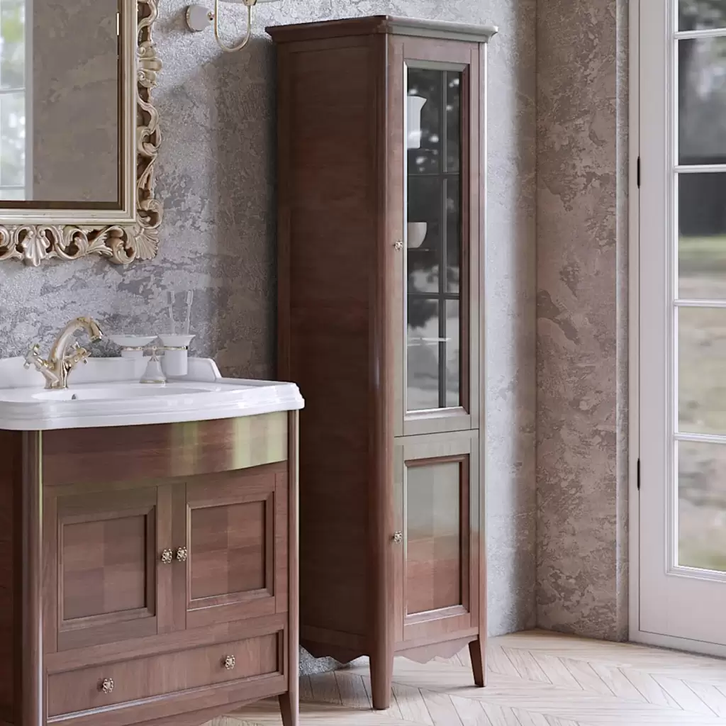 TW Veronica Nuovo колонна напольная с 2-мя дверцами, 3-мя стеклянными полками, доводчиками Blum, ручки бронза, DX - петли справа, Цвет: noce